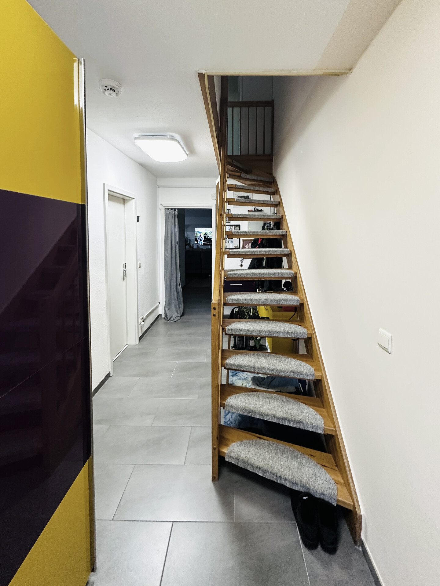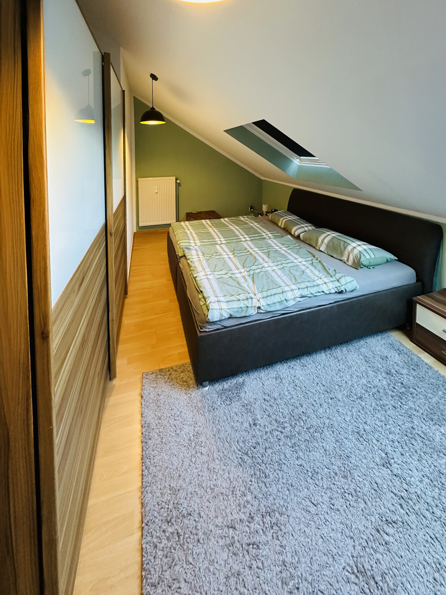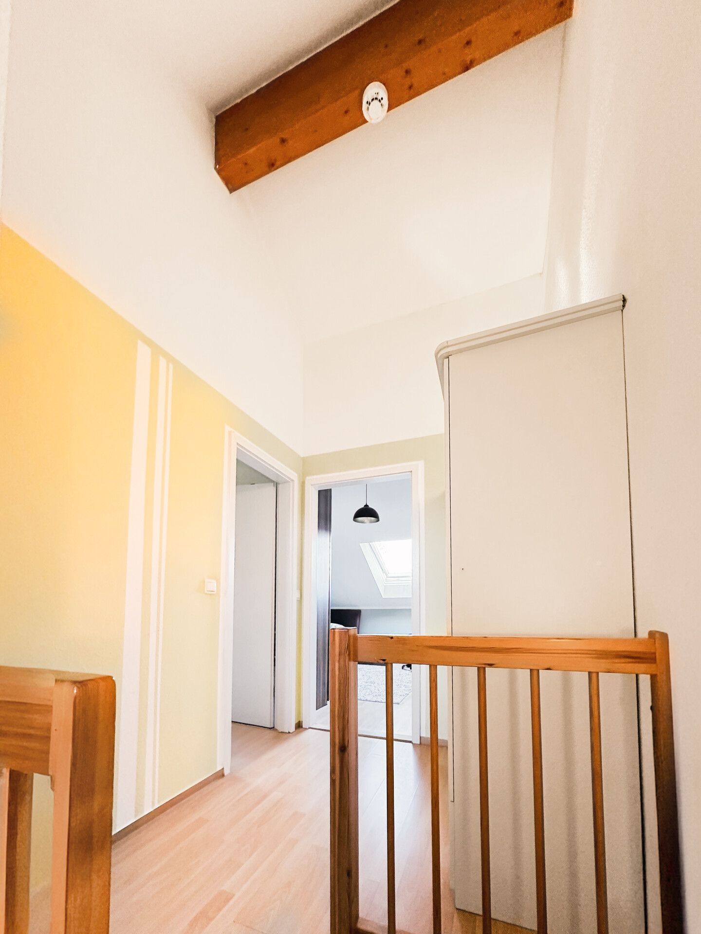 Im unteren Bereich der Wohnung befinden sich eine Diele mit Gäste-WC, ein Schlafzimmer, die Küche sowie ein großzügiger Wohn- und Essbereich. Vom Wohnzimmer und dem Schlafzimmer aus gelangt man auf die gemütliche Loggia, die den Wohnraum harmonisch nach draußen erweitert. Eine elegante Echtholztreppe führt ins Dachgeschoss, das über einen Flur, eine Abstellkammer, zwei individuell nutzbare Zimmer sowie ein Badezimmer verfügt.
