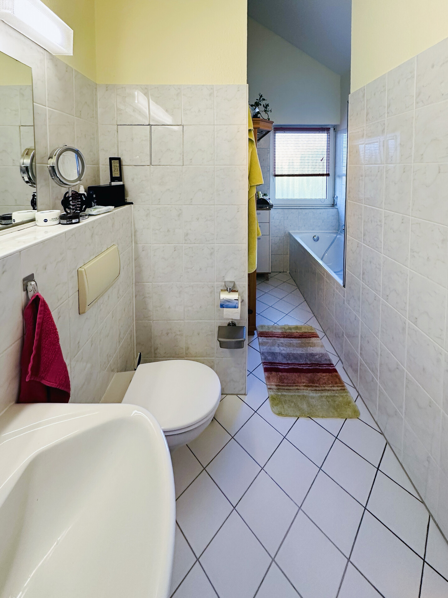 Sanitär Bad: Fußböden und Wände gefliest, Badewanne, Dusche, WC, Waschplatz, Fensterlüftung