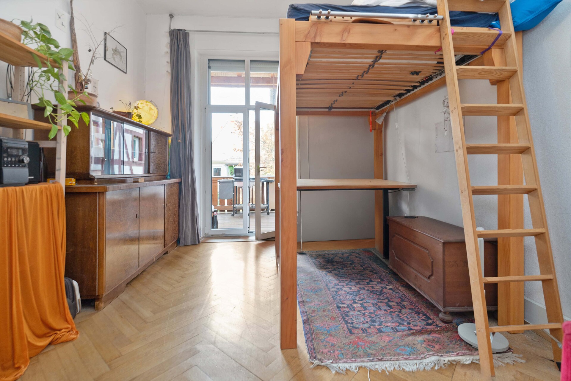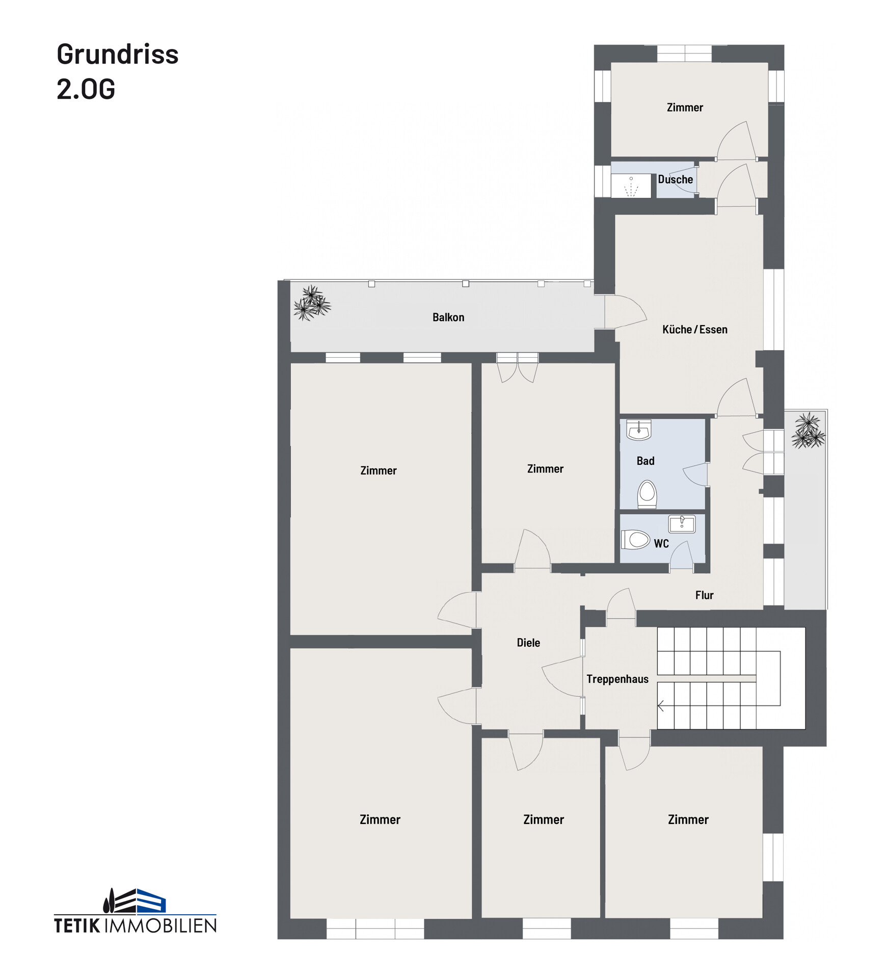 Über das gepflegte und in den letzten Jahren vollständig restaurierte Treppenhaus gelangen Sie zum Wohnungseingang. Von der zentral gelegenen Diele aus besteht Zugang zu 4 Zimmern, das 5. Zimmer erreicht man durch einen separaten Eingang im Treppenhaus. Über den Flur gelangt man zum Gäste-WC, den Bädern, der Küche und dem letzten Zimmer. Von einem der Wohnräume sowie von der Küche aus besteht Zugang auf den großen, komplett überdachten Balkon. Der kleinere, ebenfalls geschützte Balkon ist vom Flur aus begehbar.