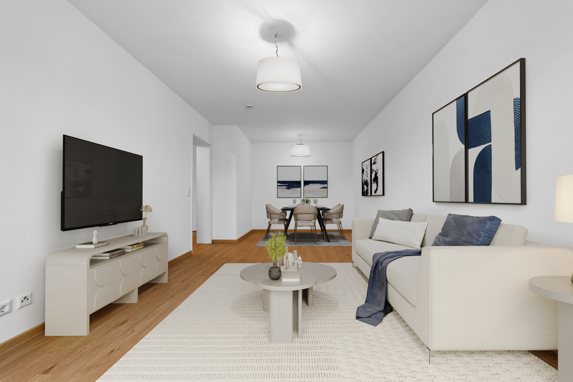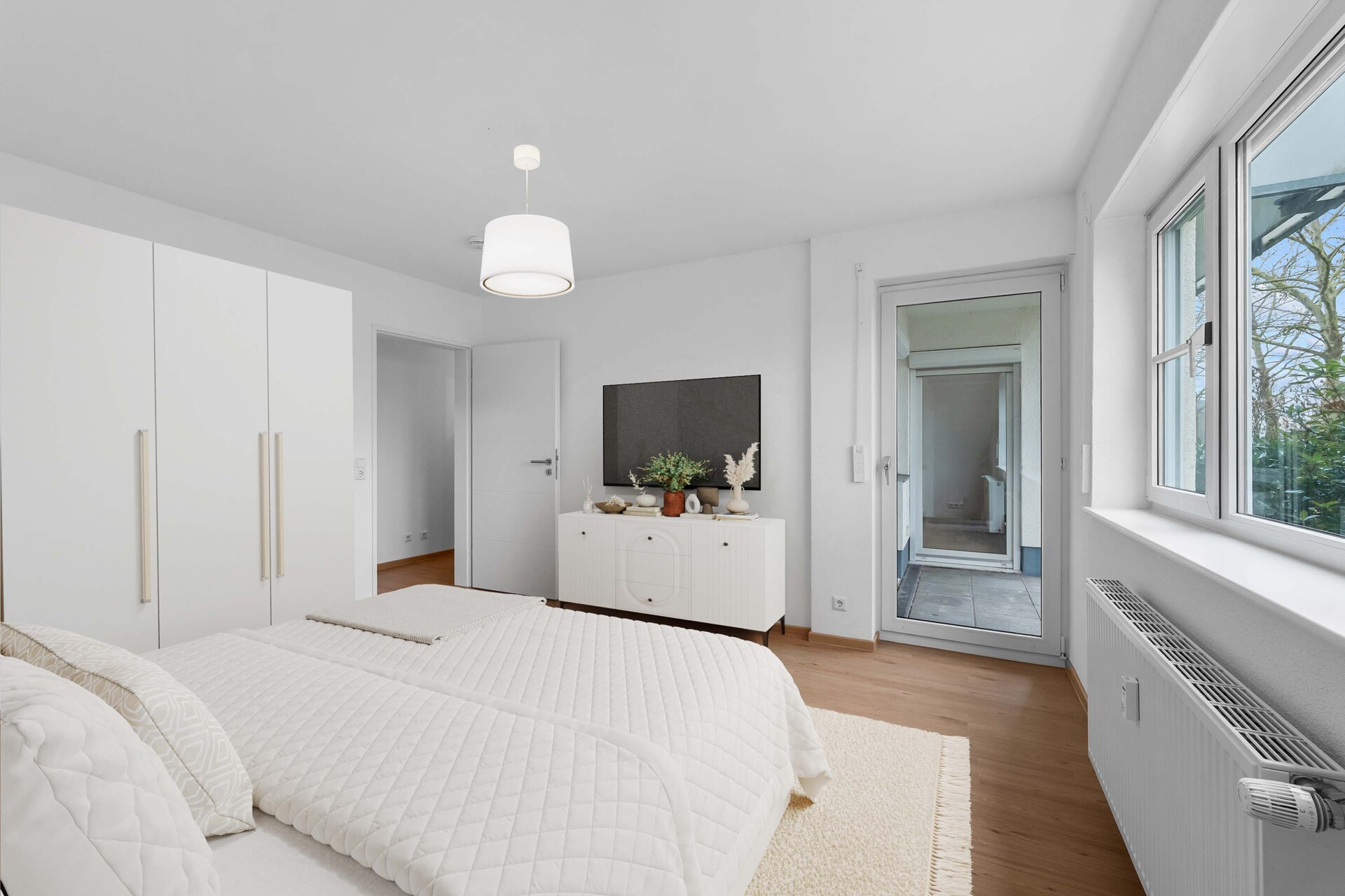 Die in den Bildern gezeigte Einrichtung im Wohn- und Essbereich sowie im Schlafzimmer wurde digital gestaged.