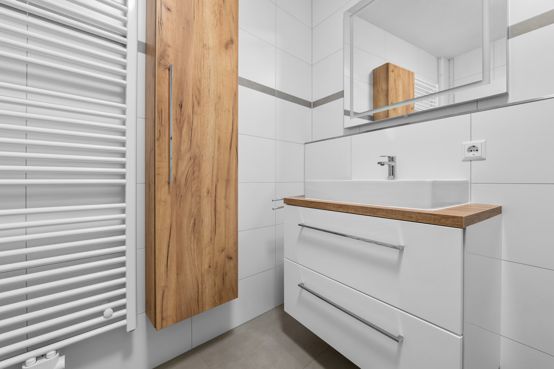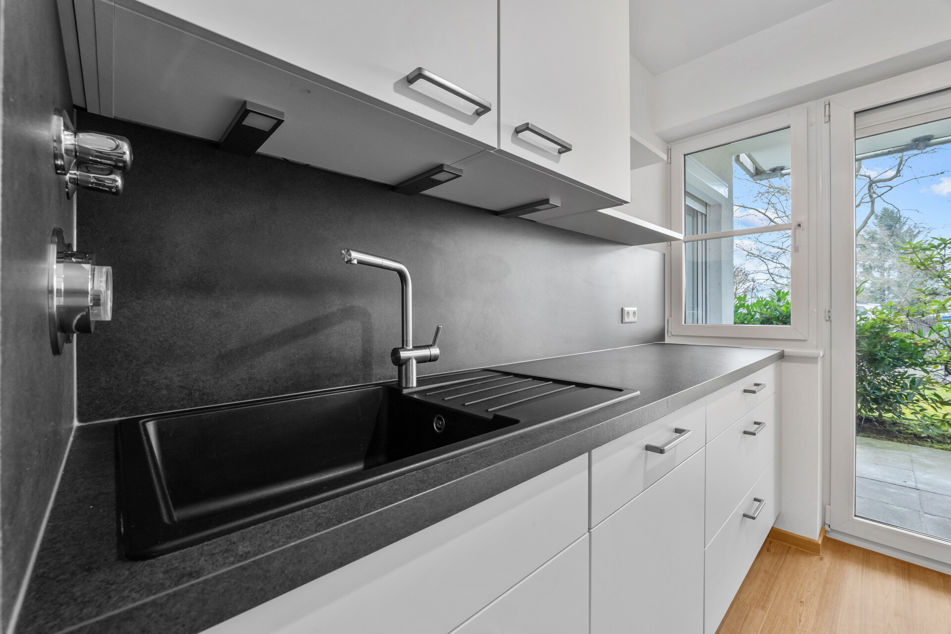 Das ruhig gelegene Schlafzimmer bietet klare Raumstrukturen und optimale Stellflächen für eine flexible Möblierung. Die separate Küche ist funktional geschnitten und mit einer modernen Einbauküche samt Markengeräten ausgestattet – kurze Wege und eine effiziente Nutzung im Alltag sind gewährleistet. Ein besonderes Highlight ist das innenliegende, vollständig neu gestaltete Bad mit bodentiefer Dusche, hochwertigen Oberflächen und sorgfältig ausgewählten Materialien. Das WC befindet sich im Badezimmer; zusätzlich besteht die Option, das ehemalige Gäste-WC wieder zu aktivieren oder den Raum weiterhin als Abstellfläche zu nutzen.