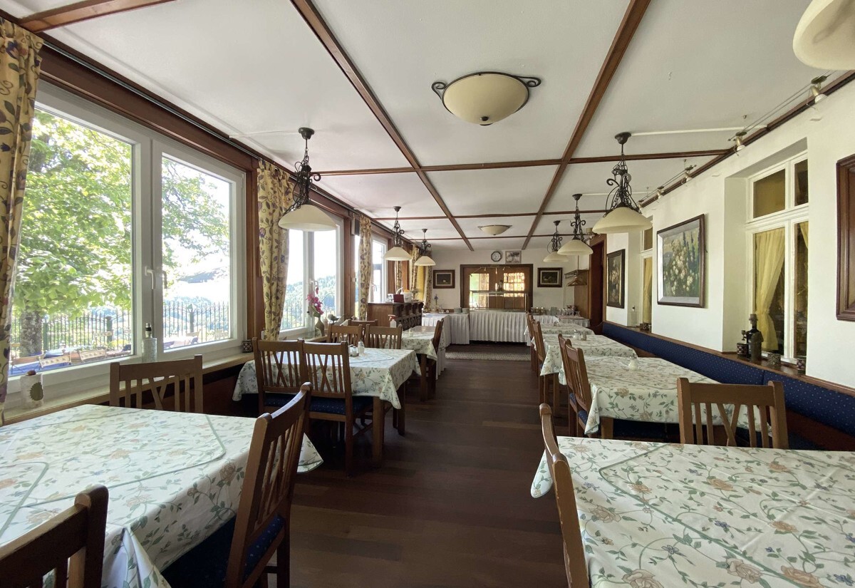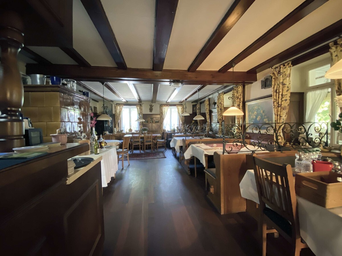 Im Erdgeschoss befindet sich die gemütliche Gastronomie im rustikalen Landhausstil. Der großzügige Gastraum mit Theke und Küche bietet rund 100 Sitzplätze und wird durch zwei geschmackvoll eingerichtete Nebenräume ergänzt, die sich ideal für private Feiern, Hochzeiten oder Firmenevents eignen. Der angrenzende Biergarten bietet zusätzlichen Platz für etwa 70 Gäste und begeistert mit einer malerischen Aussicht auf die umgebende Natur. Durch die charmante Atmosphäre und die vielseitige Nutzbarkeit stellt die Gastronomie einen stabilen Ertragsfaktor dar.