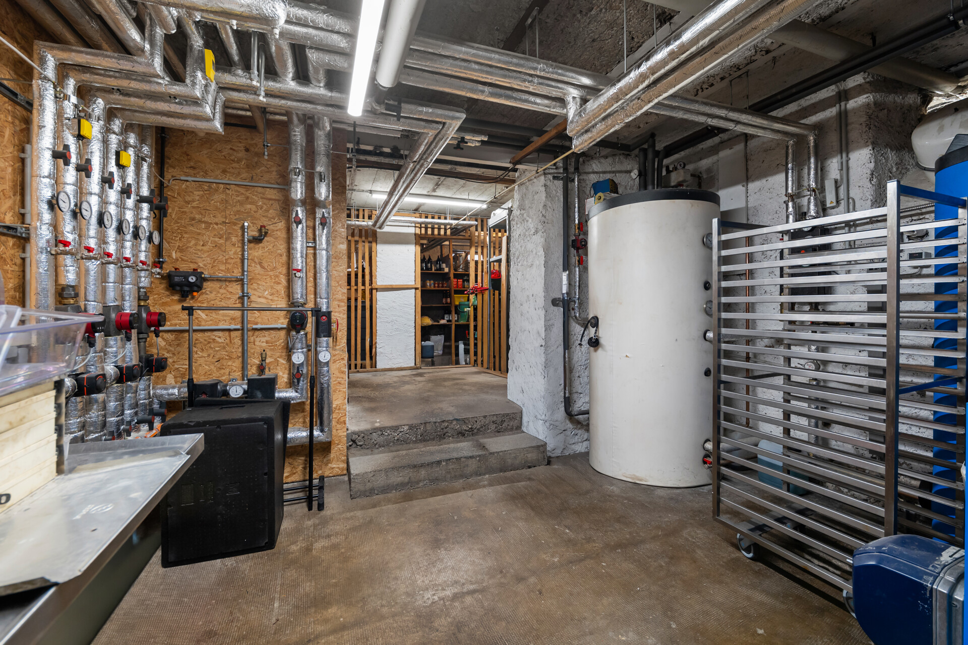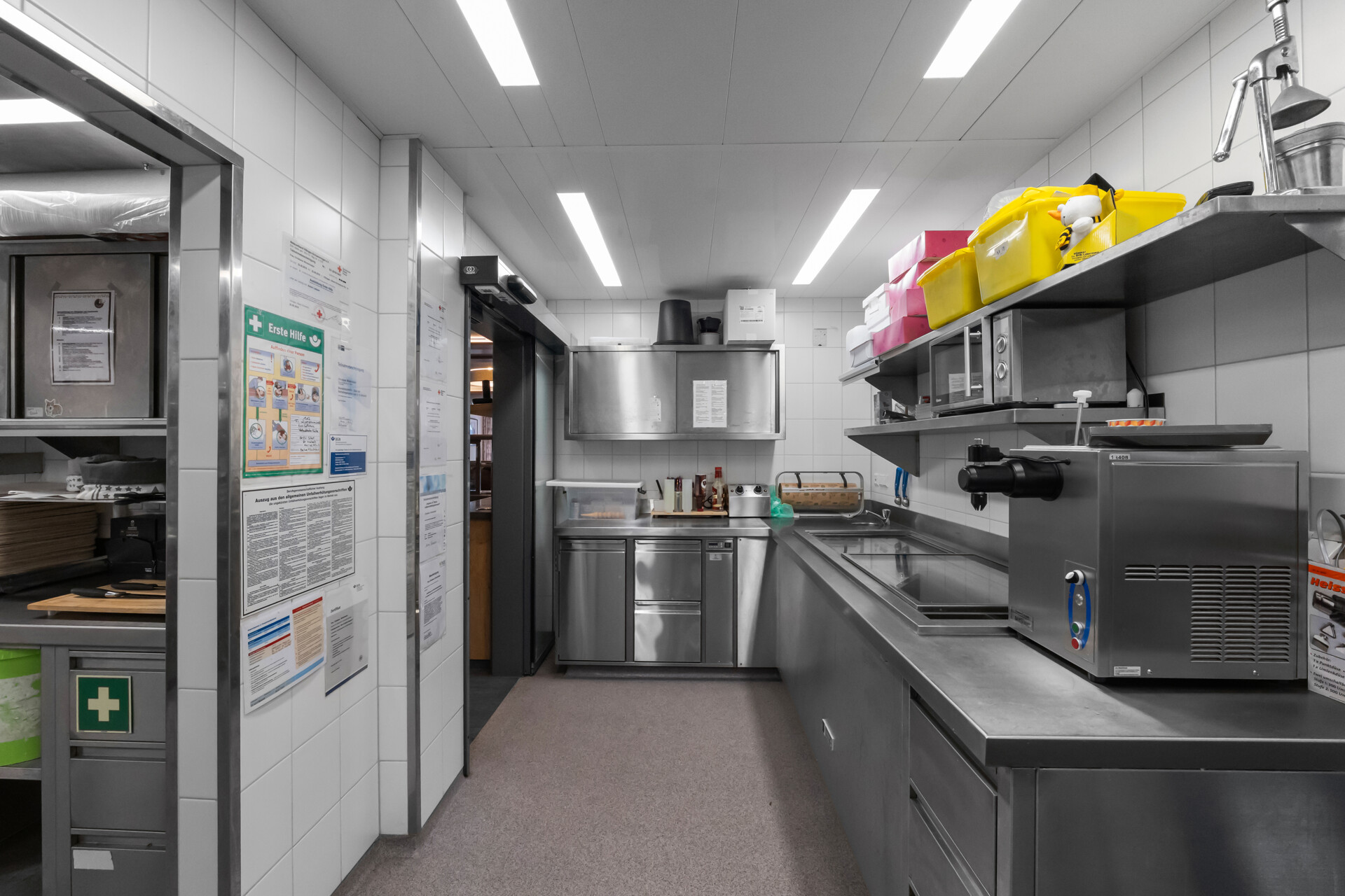 Zwischen Januar und März 2018 wurden umfangreiche Modernisierungs- und Umbaumaßnahmen durchgeführt, insbesondere in den Bereichen Technik, Infrastruktur und Betriebssicherheit (u. a. Elektrik, Leitungen, Kühlräume, Industriegastronomieküche, Wärmerückgewinnung, Solaranlage; jeweils nach Eigentümerangaben). Das Untergeschoss verfügt über funktional gegliederte Lager-, Neben- und Technikflächen.