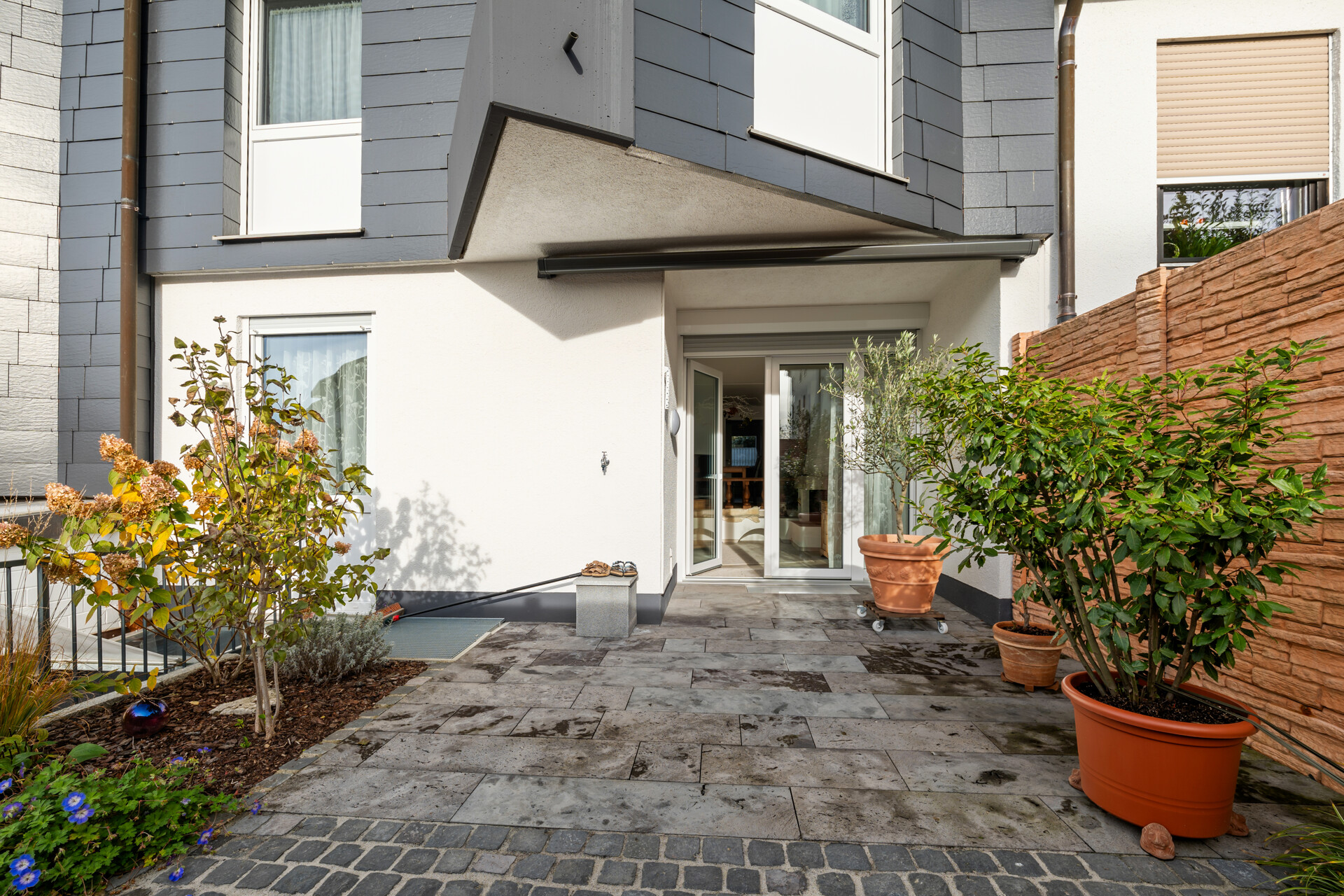 • Traumhafte Terrasse, großzügig und pflegeleicht gepflastert