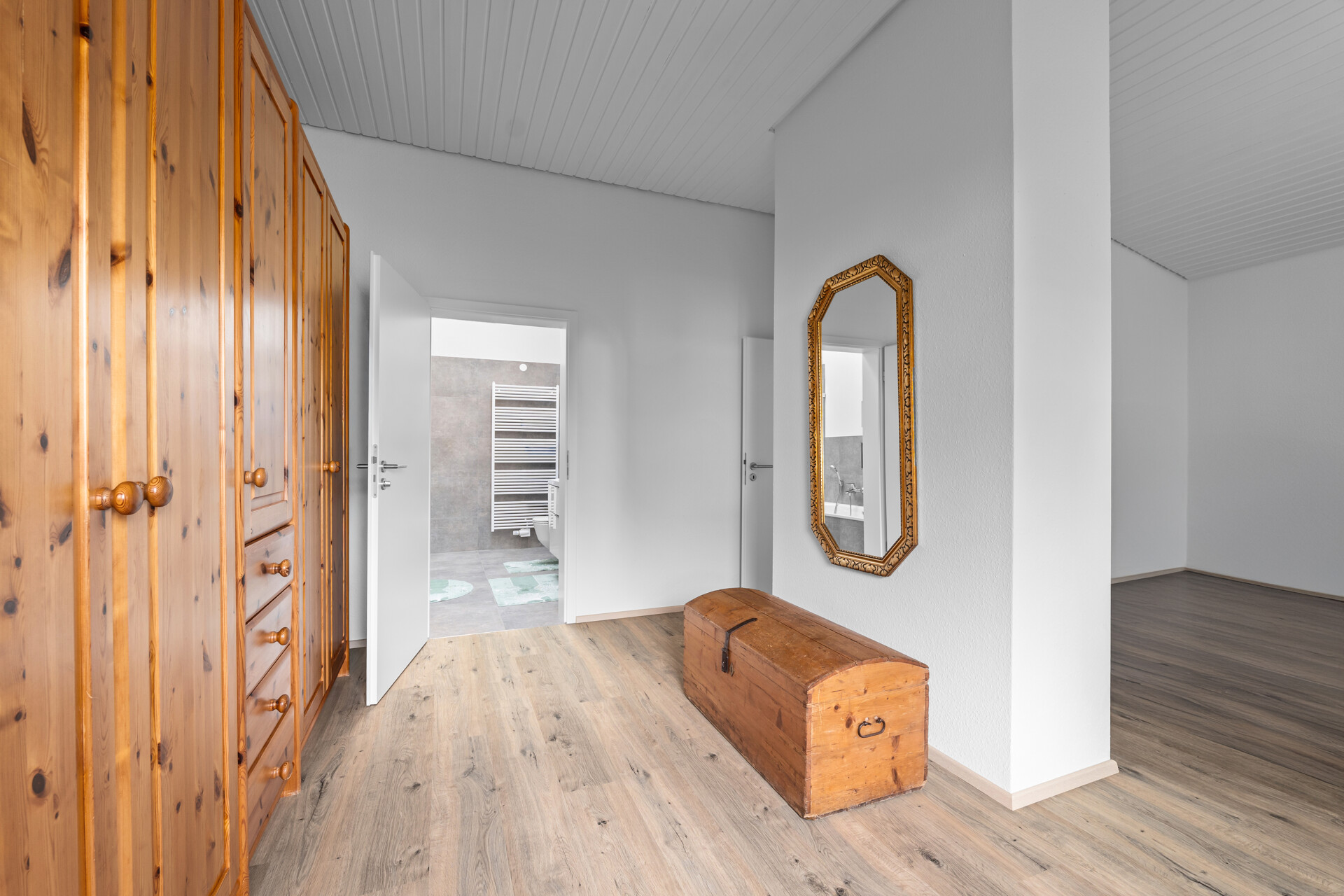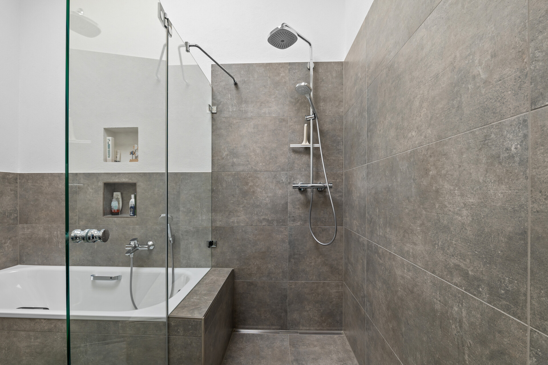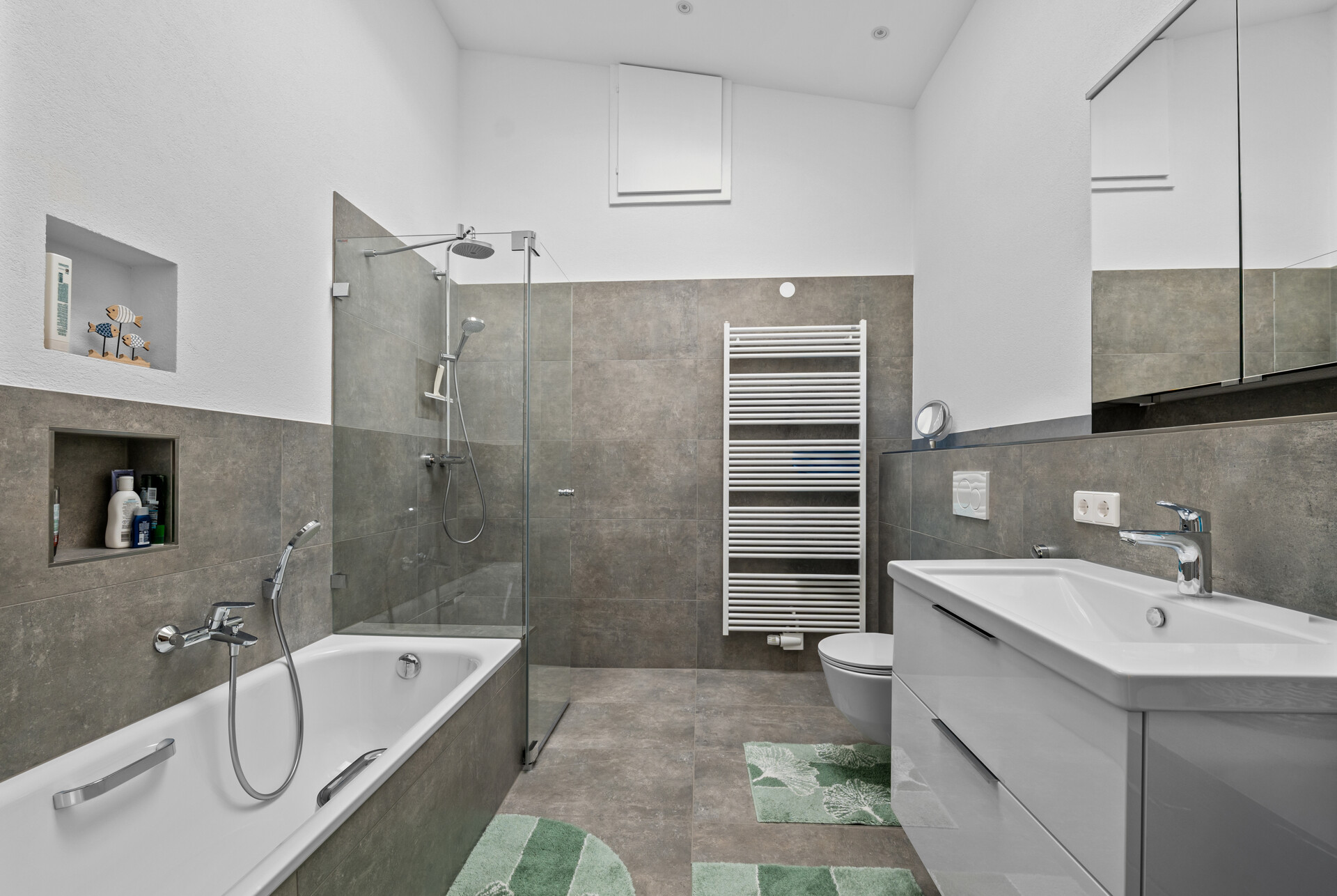 Alle Sanitärräume (Hauptbad, Duschbad und Gäste-WC) wurden vollständig neu gestaltet. Zum Einsatz kamen ausschließlich Markenprodukte von Laufen, Hansgrohe, Burgbad, Zehnder und Bette. Das Hauptbad überzeugt mit Badewanne, bodengleicher Dusche mit Echtglasabtrennung und moderner Waschtischanlage.